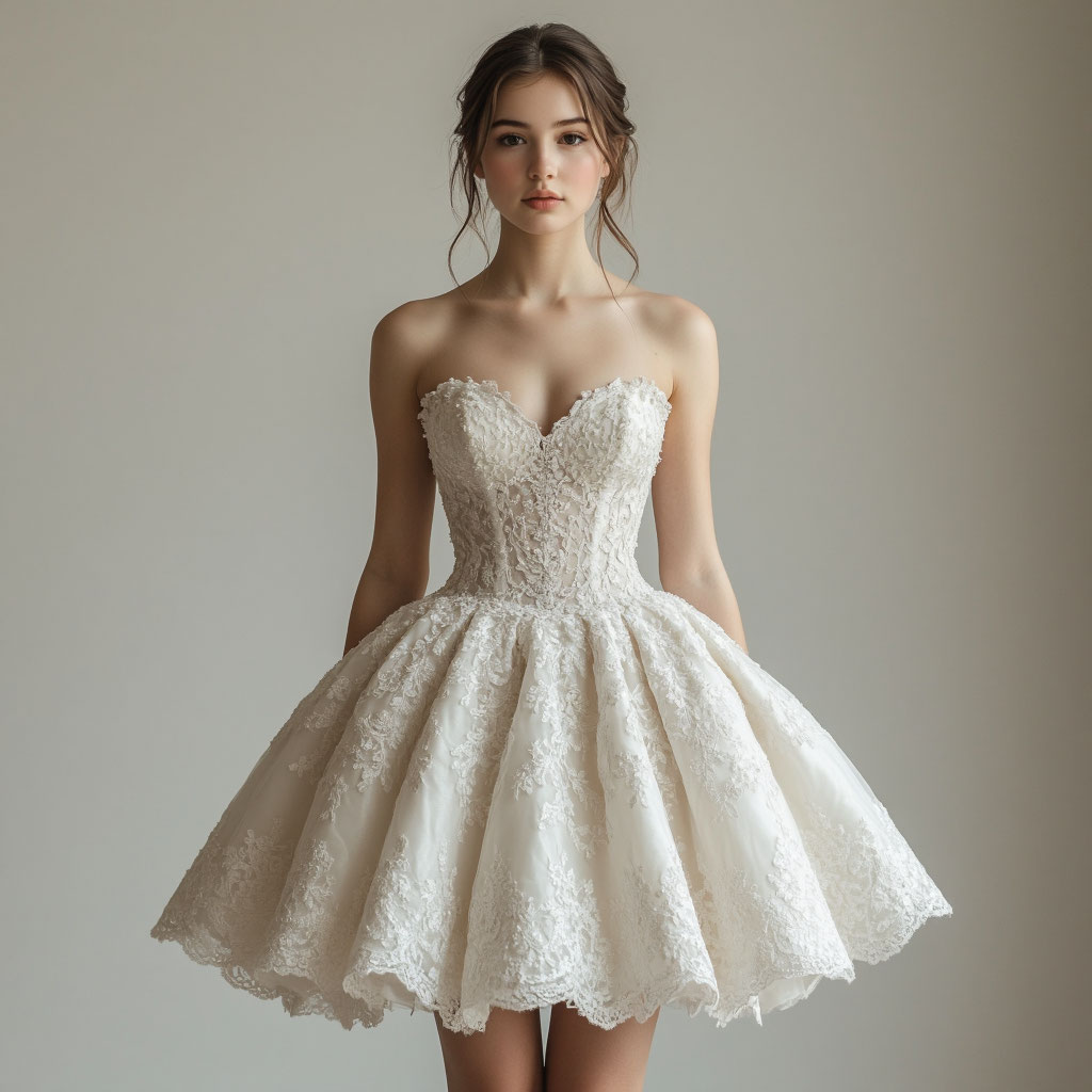 Почему короткая длина так заходит? Потому что свадьбы стали более персональными: меньше ритуалов ради ритуалов, больше движения и реальной жизни. Короткое платье не тащит за собой пол-зала, не собирает пыль, не заставляет каждые две минуты думать о подоле. И есть ещё одна штука - в кадре короткая длина часто смотрится “дороже”, потому что видны обувь, осанка и линия ног, а силуэт читается сразу.